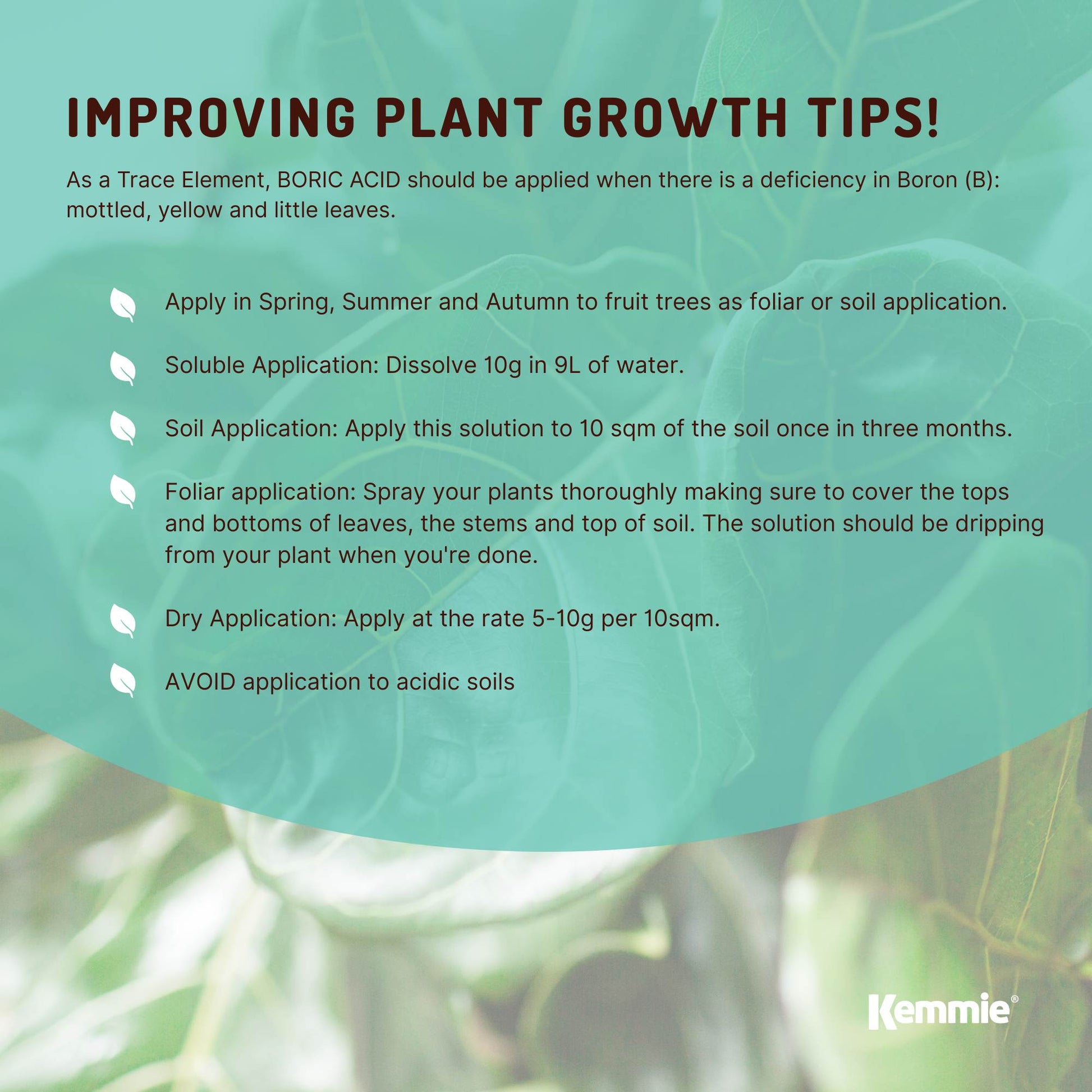 - As a Trace Element, BORIC ACID should be applied when there is a deficiency in Boron (B): mottled, yellow and little leaves.